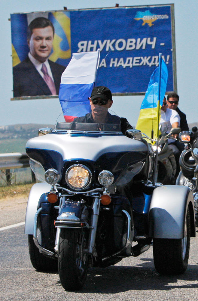 | Владимир Путин на международном байк-шоу в Севастополе (снимок 2010 года). Тогда Янукович, судя по плакату, был надеждой украинцев |