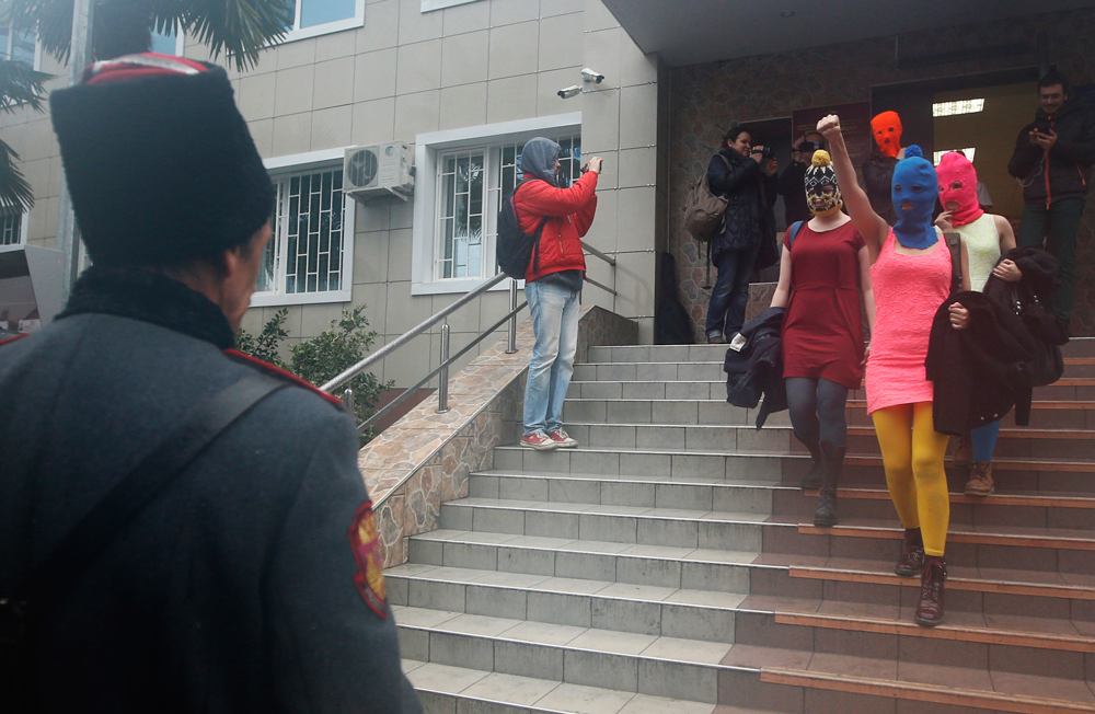 Члены панк-группы Pussy Riot прибыли в Сочи на съемки нового клипа. Бесплатной массовкой поработали казаки и полицейские