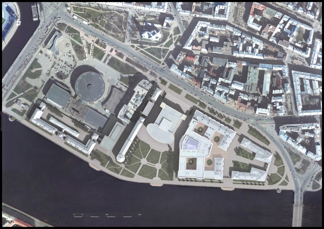 Новая версия сохранила верность базовым положениям победившей в конкурсе концепции. Это сохранение доминирующей роли творения Ринальди (предельные высоты: 13–16 м для самой ответственной зоны видимости собора, 25,5 м — макушка «фонаря» судебного здания, 28 м — для здания театра, с повышением еще на два метра в области сценической коробки). Второе — максимально возможная в заданных обстоятельствах открытость территории. Больше трети (3,5 га) отведено под общественную зеленую зону, впервые в Петербурге организуется пешеходная набережная (протяженностью почти 2 км — от Биржевого до Тучкова моста), доступным для горожан будет даже первый этаж служебной гостиницы, где разместятся кафе и прочие объекты общественного назначения. В дополнение к существующему близ Тучкова моста запроектированы еще два спуска к воде, выдержанные в той же стилистике. Закрытым остается лишь небольшой участок — с «замковой» планировкой главного здания Верховного суда. Ожидается, что большую часть времени свободным для посещения будет и пространство перед ним, куда попадаешь через обращенную к площади Лихачева входную зону с пропилеями. Для безопасного перемещения людских потоков авторы проекта предлагают городским властям организовать подземный переход с площади: а то сейчас там, по выражению Максима Атаянца, пешеходам приходится зайцем скакать. От зайцев архитектор перешел к «зеленой собачке» — ее роль предусмотрительно была отведена пропилеям. Максим Борисович ранее уже признал, что намеренно усилил их стилизацию, обратясь к цитированию этой части проекта Ивана Фомина (в свою очередь, буквально цитировавшего корпуса Адмиралтейства), дабы было что без особых сожалений принести в жертву критикам. Второй потачкой стал отказ от содержавшихся в первом архитектурном решении театра реминисценций римских сооружений.