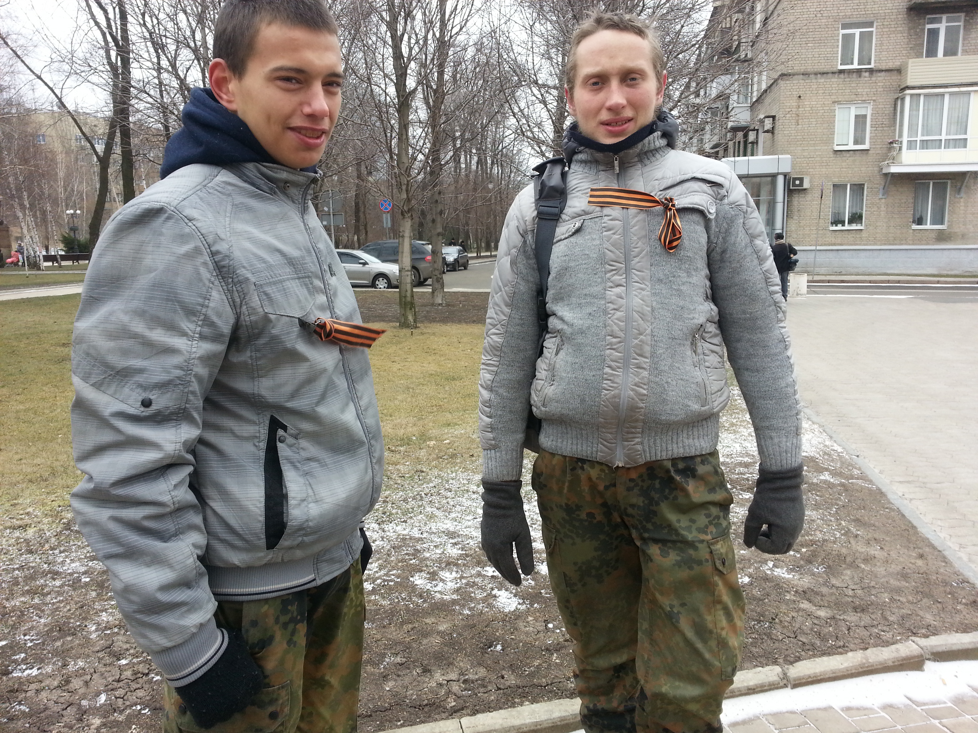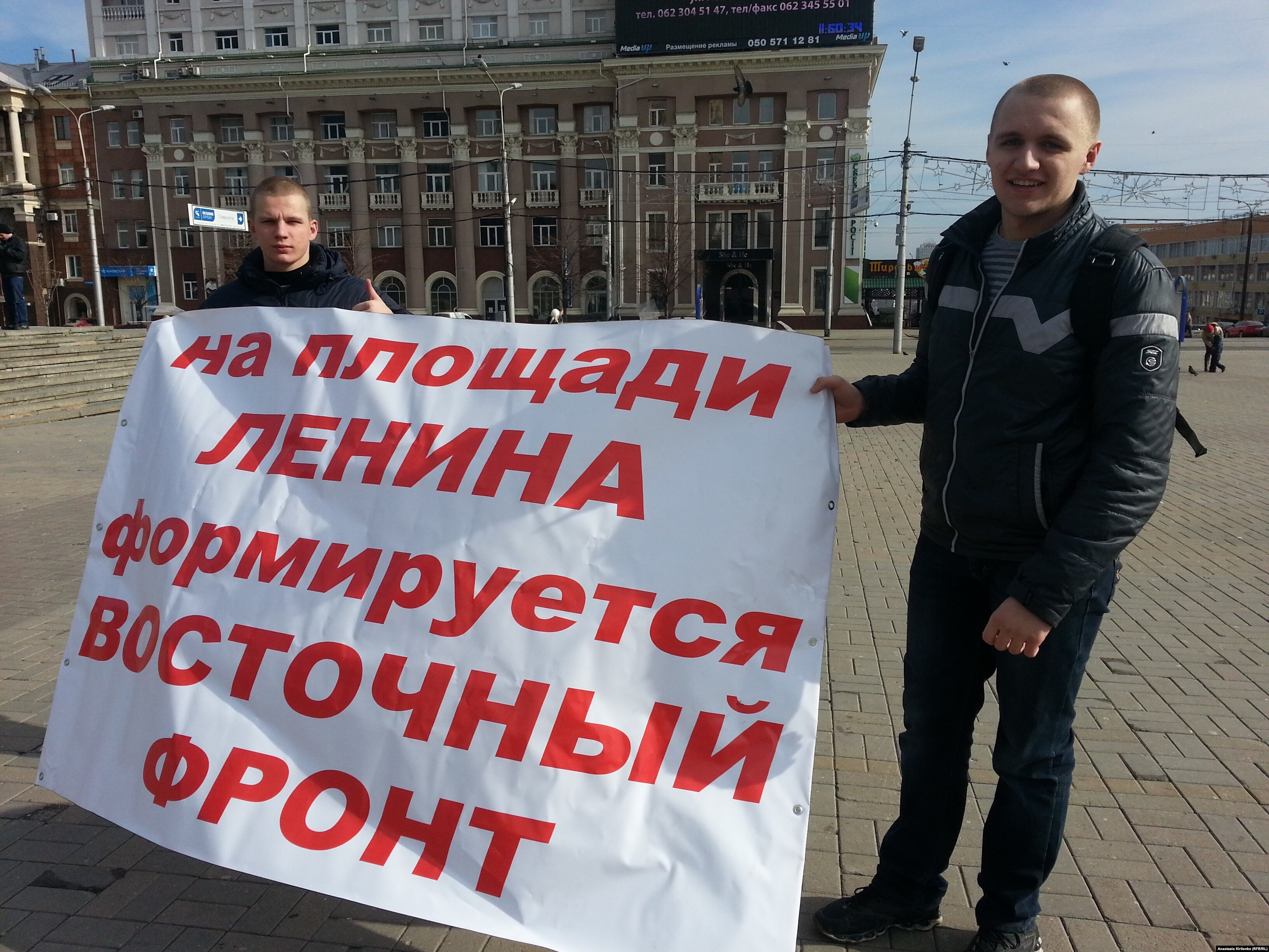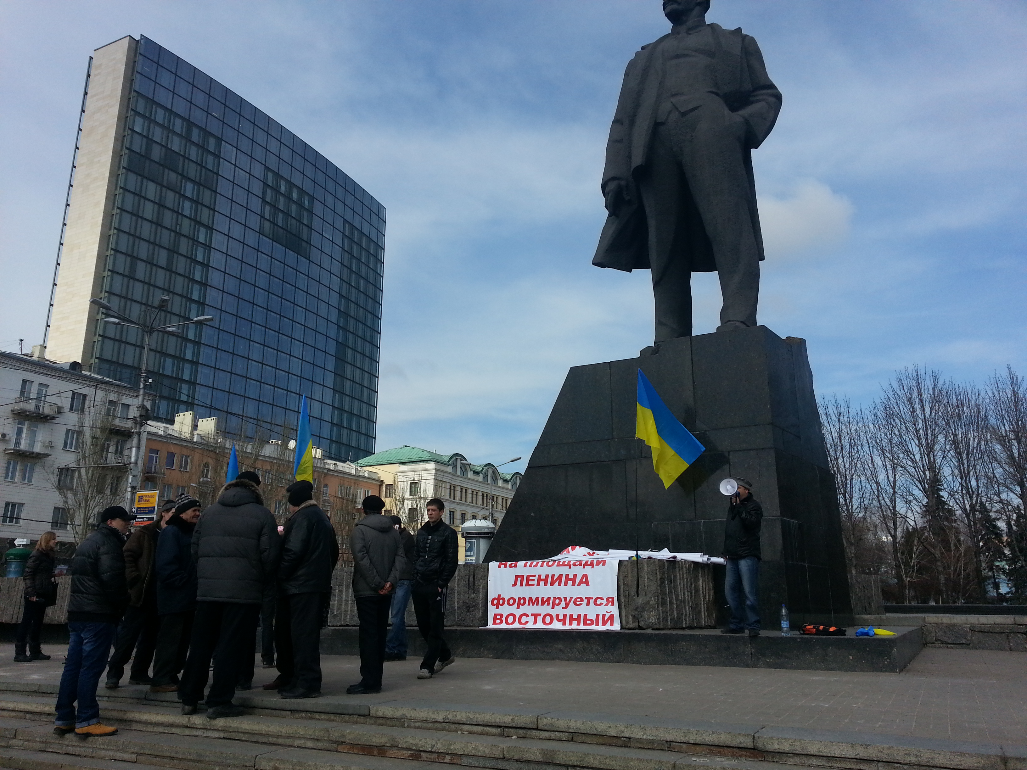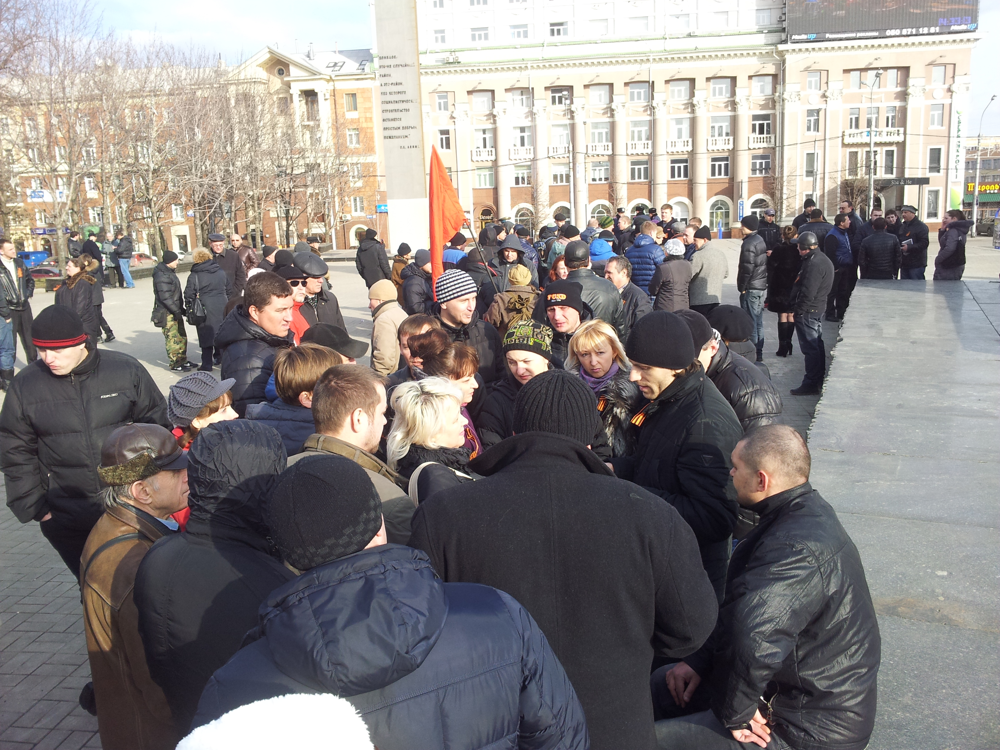 Тем временем в день фактической победы Евромайдана в субботу на площади Ленина в Донецке собрался "Восточный фронт" самообороны. В начале было человек 30. Один из протестующих, не стесняясь, отпивал настойку пиона из аптечного бутылька. Другие возмущались, что на площади нельзя курить и бросать окурки.