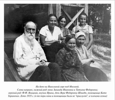 И дед, которому тогда было уже 65 лет, едет к ней на фронт (один Бог знает, как он добирался). «Я решился сделать поездку в армию к Нюсе, чтобы удостовериться на деле, как она устроилась, и помочь ей... Я привез Нюсе с собою: 2 ф. шерстяной ваты и подкладку для отепления шинели (как у меня), 4,5 аршина солдатского гвардейского сукна защитного цвета на теплую гимнастерку и брюки и 1,5 аршина солдатского шинельного сукна на брюки и шведскую куртку; теплые чулки, портянки и разные мелочи. Там, в полку, свои портные сошьют ей все это в два-три дня. Командир полка сказал мне, что он не будет чинить препятствий к увольнению Нюси хоть и сейчас, если только она пожелает. Но она не желает, хочет, если продлится война и если она выдержит, побыть солдатом год, а затем поступить в 8-ой класс гимназии, чтобы получить аттестат зрелости. В общем я доволен остался Нюсей и всем виденным там...» (17.09.1917). Когда Нюся все же вернулась из армии, Ф. Ф. стал искать ей место для работы, потом помогал в организации ее свадьбы, потом молодые жили у него, и он их кормил, потому что у ее мужа не было работы, и т. д. и т. п.