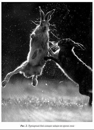 В заключение напомним читателям, что «заяц» как поведенческий тип — это метафора, в основе которой лежит общая тенденция его поведения. Реальные зайцы не только затаиваются. В целом ряде ситуаций зайцы способны к стремительному бегу, яростному сопротивлению врагу и отчаянным схваткам друг с другом (рис. 2).