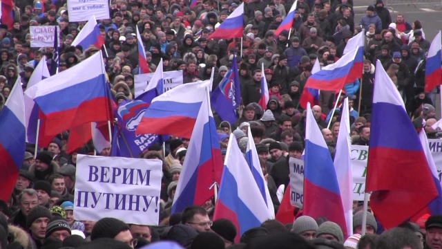 В Москве в воскресенье прошло массовое шествие в поддержку интервенции на Украину. Около 20 тысяч человек, в основном сотрудников бюджетных предприятий, прошли под лозунгами "Путин, мы с тобой", "Крым не отдадим", "Слава Беркуту", "Майдан не пройдет" и другими. Заявка на мероприятие "Народный сход за братский народ" была подана накануне молодежными и ветеранскими организациями и согласована в срочном порядке.
