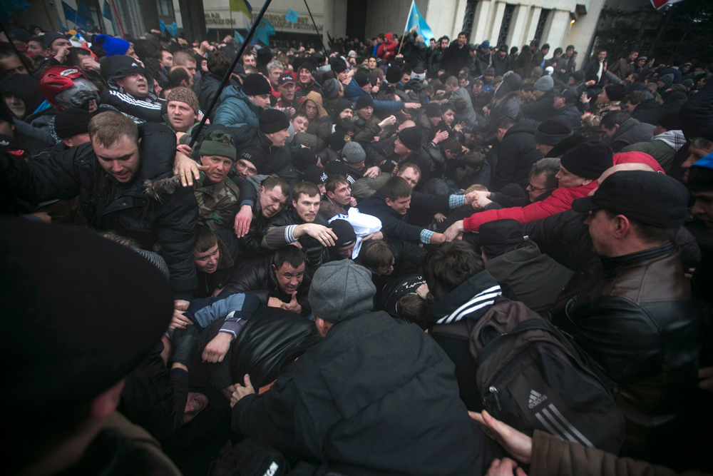 Вокруг Рады (в советское время ее за форму здания называли Пентагоном) стоит линия милиционеров, перед входом — баррикады из деревянных палет и поломанной мебели, внутри — местные депутаты под дулами неизвестных людей отправляют в отставку местное правительство и принимают решение о проведении референдума о статусе Крыма, да еще назначают его на 25 мая, когда на остальной Украине будут выбирать президента.