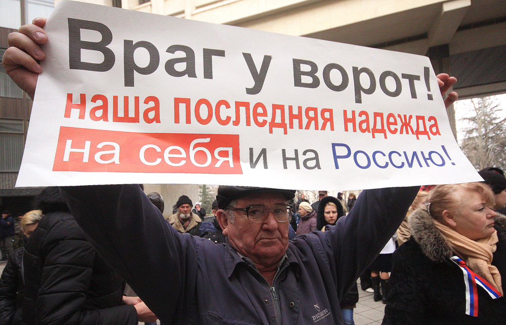 В полуразрушенном, неубранном, неуютном Симферополе с разбитыми дорогами, по которым ездят еще более разбитые «жигули» и троллейбусы 60-х годов, с заброшенными особняками XIX века, оскалившимися пустыми окнами, в которые тянут ветки унылые зимние деревья, — в этом городе ощущение то ли Москвы 1993-го, то ли Петрограда 1917-го. Машин на улицах мало, большая часть магазинов и ресторанов в центре закрыта, прилегающие к Раде и кабмину улицы перекрыты милицией. Из уст в уста передаются слухи об осадном положении Крыма, которые, впрочем, воспринимаются как хорошие новости: лишняя защита от «бандеровской заразы» не помешает.