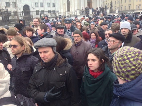 15:13 Протестующие на Манежной площади не дали задержать пожилую женщину, постоянную участницу протестых митингов. С плакатом против ввода войск в Украина, она стояла на ступеньках, рядом с часами, которые отсчитывали время до начала Олимпиады. 4-5 ОМОНовцев поднялись к ней и попытались ее задержать, но люди вокруг пристыдили ОМОНовцев.