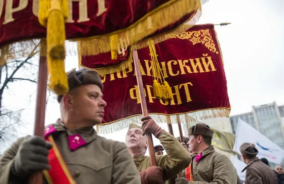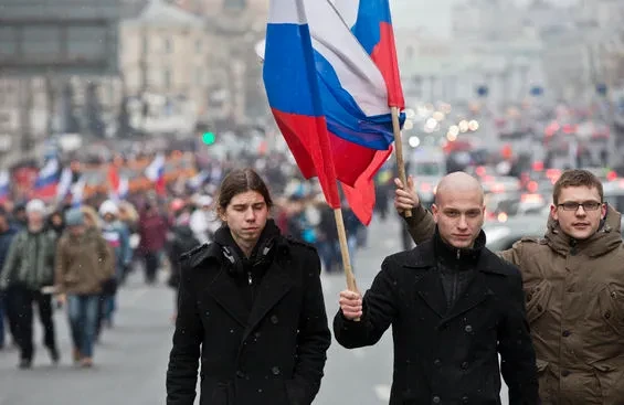 Главная причина вмешательства России — необходимость спасти русскоговорящее население в Украине от фашистов и американцев, считают многие из идущих. «Если Обама против, что Владимир Владимирович вводит войска — его заинтересованность в том, чтобы развалить и подмять под себя Украину», — уверен пожилой мужчина, тихим голосом он рассказывает по заговор Америки и внезапно добавляет про Библию: там сказано, что все народы когда-нибудь объединятся, пора и нам объединиться с украинцами. Ухоженная дама в шубе несет нарисованный на обоях рукописный (редкость на этом марше) плакат: «Госдеп и НАТО — подгузники фашизма!» «Я в школе работаю — так там в младших классах чуть ли не все дети уже нерусские. У них план, чтобы над кремлевскими башнями их полумесяц был», — делится другая дама с соседом по колонне, плавно переходя от обсуждения американцев к другому врагу.