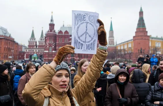 Виктория и Михаил кричали постой лозунг «Нет войне!», взявшись за руки. Вика выросла в Украине, Михаил — россиянин. На митинге оба — первый раз в жизни. «У меня в стране не ущемляют русский язык, я-то знаю. Я училась в украинской школе, но никто нам не запрещал говорить по-русски», — говорит Вика. «Братские народы пытаются стравить между собой», — сжимая ее ладонь, добавляет Миша.