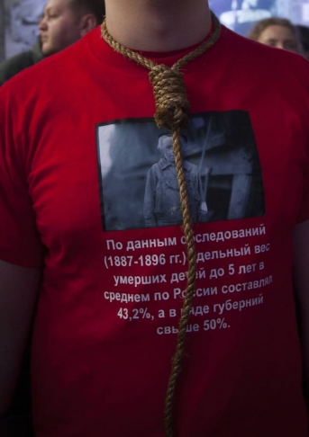 Восемь человек, одетых в красные футболки с надписями и с пеньковыми веревками на шее – в память о замученных вольнодумцах и бунтарях – зашли в воскресенье на выставку "Романовы" в ЛЕНЭКСПО, посвященную последней царской династии. "Выставка работала последний день, был наплыв посетителей. У нас, конечно, не было цели ее срывать. Наша цель – противостоять мифологизации истории. Она идет в понятном ключе: насаждаются "традиционные ценности", ужесточается режим. И царская империя представляется образцом государственности и величия, но за помпезным фасадом крылись довольно неприглядные вещи. История – это не миф, а наука, она не складывается в приятную череду героев и побед – все очень сложно и противоречиво. А такие выставки способствуют не просвещению, а насаждению невежества", – объясняет Иван Овсянников из петербургского отделения РСД. Московские товарищи наших социалистов провели такую же акцию, когда выставка работала в столице: удивленным посетителям они читали антимонархические стихи поэтов Серебряного века.