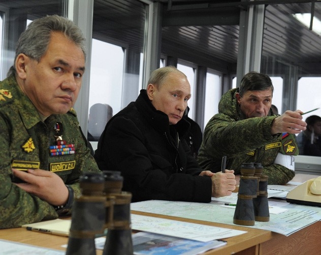 Министр обороны РФ Сергей Шойгу, президент России Владимир Путин и командующий войсками Западного военного округа Анатолий Сидоров (слева направо). Фото: ИТАР-ТАСС / Михаил Климентьев