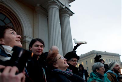 © Юлия Рыженко «Символика этой акции удивительна проста, поскольку она полностью восходит к библейскому мифу, который рассказывает о примирении Творца со всеми выжившими в то время живыми существами. На небе появился голубь с веточкой оливы над ковчегом Ноя, в котором находилось все будущее население. Мы постарались как-то соединить различные смыслы, которые существуют сейчас , которые связаны и с Библией, и с этим мифом, и с историей использования голубя как птицы мира, как птицы-посла, как символа надежд», — объяснил другой участник акции, художник Виктор Рибас.