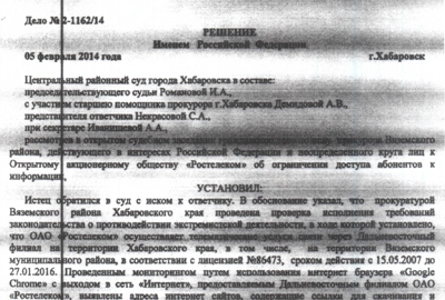 Центральный районный суд Хабаровска обязал местный филиал «Ростелекома» заблокировать доступ к «Яндексу», «Википедии» и «Кинопоиску».