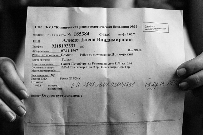 – Видели когда-нибудь такую медицинскую карту? – Елена Алиева протягивает листы бумаги. – Здесь вместо прописки стоит – "бомж". Представляете, каково мне было, когда я с этой справкой пошла к врачу, а она прочитала надпись "бомж" и тут же пошла мыть руки?