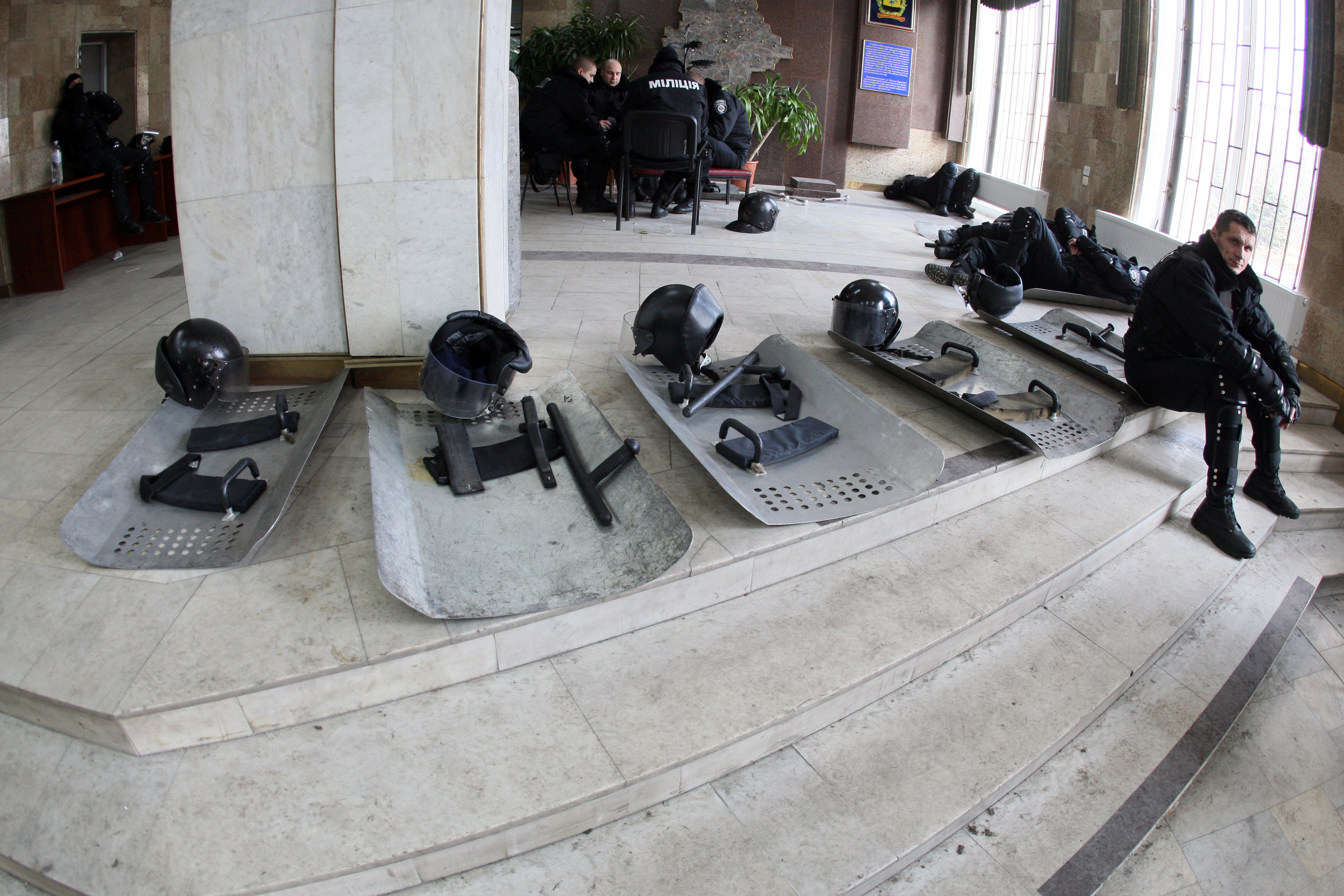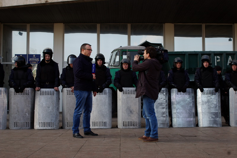 С утра милицейское начальство собрало экстренный брифинг для журналистов – случай такой же редкий для Донецка, как и вообще акции протеста, не говоря уже о столкновениях их участников. По словам представителей правоохранительных органов, занявшие здание активисты “Народного ополчения Донбасса” не только разбили аквариум и повредили отделку здания, но и разграбили “красный уголок”, в котором хранились ордена и медали известных донецких ветеранов войны. Отчитались о пострадавших при вчерашнем нападении сторонников интеграции с Россией на “майдан”: 10 человек, с обеих сторон, ножевых ранений, слухи о которых будоражили город накануне ночью, нет. Ситуацию с Павлом Губаревым милиция комментировать отказалась, сославшись на то, что делом занимается СБУ. Зато собравшиеся узнали, что донецкий “Беркут” в полном составе прошел переаттестацию и теперь называется, как в России, “отрядом милиции особого назначения”.
