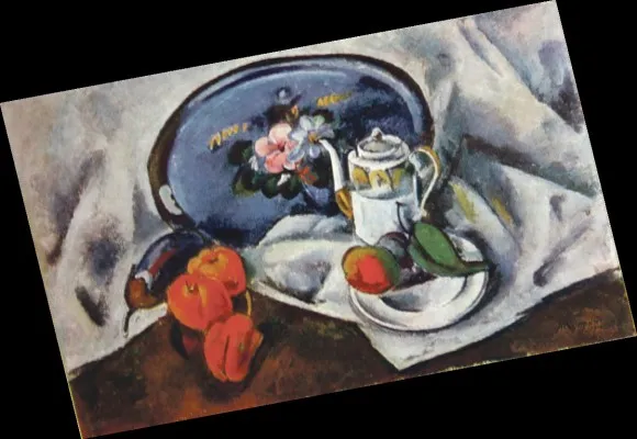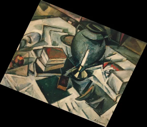 «Напор устремления и энергии» мы и видим в натюрмортах Куприна, хотя предметы изображения у него всегда самые скромные. Цветистость — это вообще не про Кузьмина, зато цветность представлена чаще всего традиционным русским жестяным подносом, а также сложным соотношением масс — будь то глиняные горшки, фаянсовая кружка или книги. И еще он постоянно писал яркие искусственные цветы, которые делал сам и снабжал ими друзей-художников, так что эти же цветы можно увидеть в натюрмортах Машкова и Фалька.