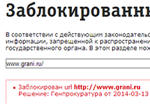 Ряд российских интернет-провайдеров в четверг заблокировал доступ к сайтам Грани.Ру, Каспаров.Ру и EJ.Ru. Роскомнадзор разъяснил, что эти сайты внесены в реестр запрещенной информации по требованию Генпрокуратуры за "призывы к противоправной деятельности и участию в массовых мероприятиях, проводимых с нарушением установленного порядка".