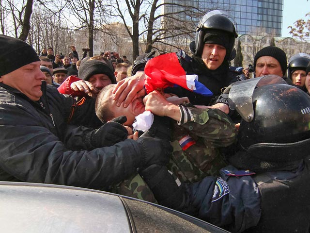 В ходе столкновений между митингующими в поддержку единства Украины и участниками пророссийской акции в Донецке погиб один человек. Еще трое демонстрантов получили тяжелые травмы.