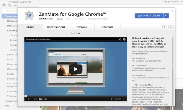 Приложение ZenMate для Google Chrome