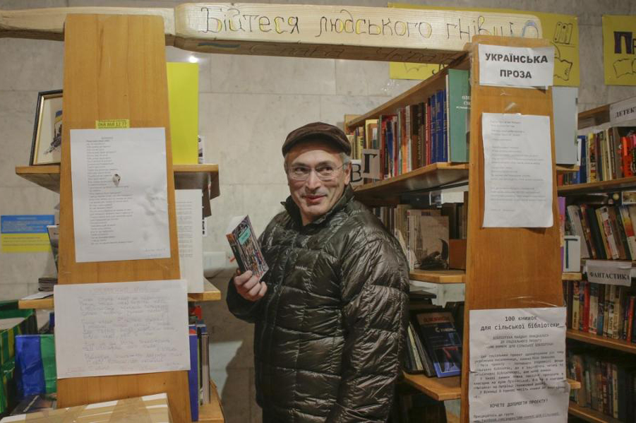 | В библиотеке Майдана книги на украинском и на русском языках. Киев, 09.03.2014 г. |