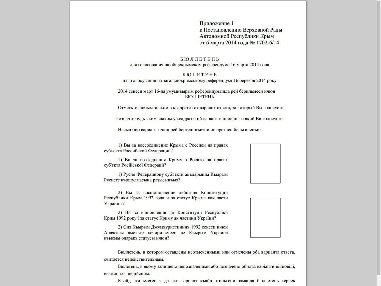 «За статус Крыма в качестве части Украины проголосовали 31 тысяч 997 человек, что составляет 2,51%. Число бюллетеней, признанных недействительными — 9 тысяч 097, что составляет 0,72%».