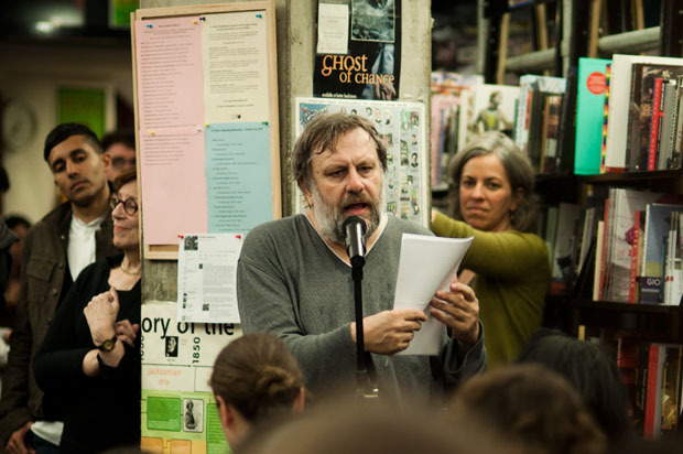 Славой Жижек выступает в книжном магазине St. Mark's Bookshop в Нью-Йорке 27 октября 2011 года