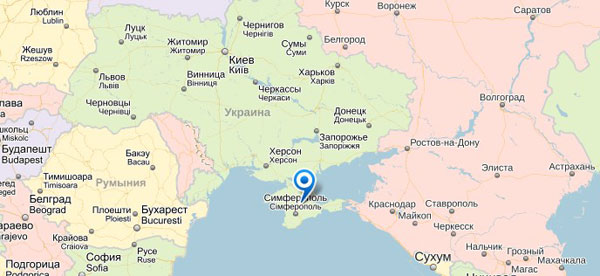 Пока что, понятно, изменения в электронные карты не внесены. Во-первых, российский парламент еще не принял официального решения о включении Крыма в состав Федерации, во-вторых, изменения вносить все же чуть сложней простого перекрашивания куска карты, как это делают пользователи Википедии.