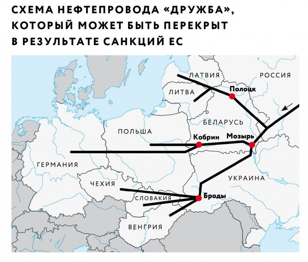 Схема Нефтепровода «Дружба», который может быть перекрыт в результате санкций ЕС