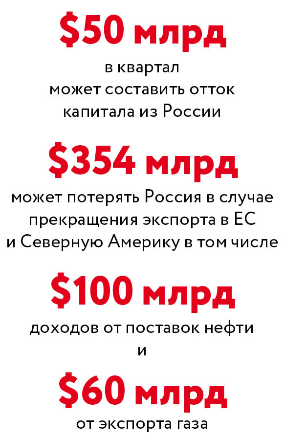 Кроме того, в случае жестких санкций по иранскому сценарию Россия не сможет больше торговать ни со странами ЕС, ни с США и Канадой. Совокупная доля российского экспорта, приходившаяся на эти регионы в 2013 году, составила порядка 66%, то есть около $354 млрд. Если же санкции затронут только экспорт российских углеводородов, то потери от остановки европейских поставок могут составить до $100 млрд по нефти и $60 млрд по газу.