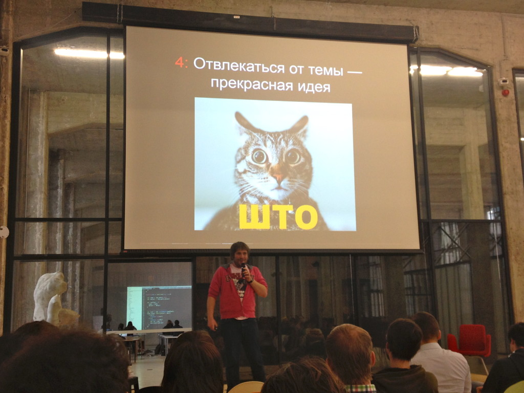 О том, как правильно подойти к созданию презентации, рассказал Виталий Паньков, соорганизатор PechaKucha Moscow, просмотревший не один десяток презентаций спикеров за пультом оператора.