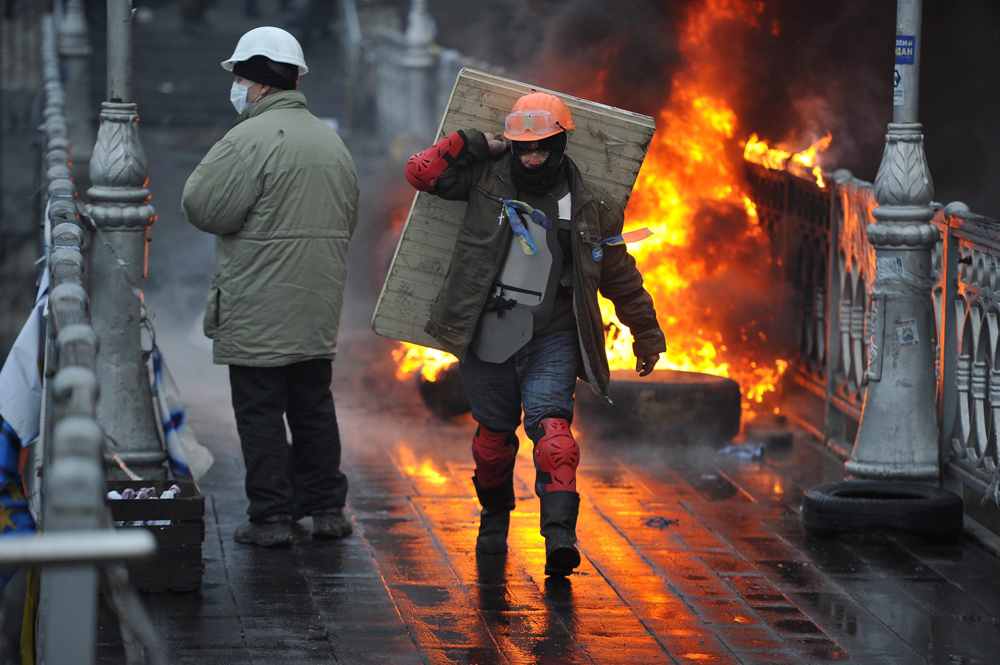 Чтобы оценить правдивость президента, достаточно посмотреть на любое изображение этой самой «хорошо оснащенной армии» — фотографии противостоявших «Беркуту» людей в строительных касках, потрепанных бушлатах, с палками и деревянными щитами обошли все мировые и российские СМИ.