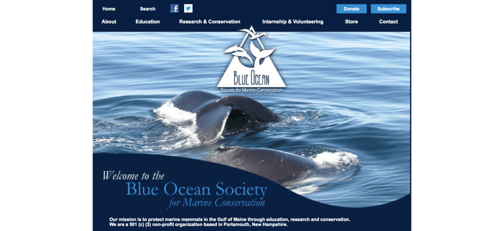 Blue Ocean Society занимается защитой морских животных и окружающей их среды в заливе Мэн, проводя для этого различные исследования и образовательные программы. Группа была основана Джен Кеннеди и Дианой Шульте (Jen Kennedy, Dianna Schulte), которые наблюдали, как ученые были фрустрированы отсутствием возможности «перевести» исследования в информацию, которая могла бы быть использована широкой аудиторией.