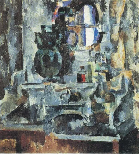 «Умывальник» (1910-е) — своего рода «стоп-кадр», зафиксировавший этот процесс. Такой массивный фаянсовый умывальник я еще застала в начале 1950-х — кажется, в ленинградской «Астории». При одной мысли, что соцреализм предлагал на холсте всё изображать как в жизни, уже охватывает тоска.