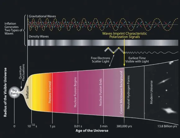 Квантовые флуктуации, имевшие место на стадии инфляции, дали не только неоднородности плотности: они также породили реликтовые гравитационные волны. Еще до возникновения теории инфляции Леонид Грищук показал, что в расширяющейся Вселенной генерируются гравитационные волны. Впоследствии Алексей Старобинский количественно описал этот процесс для случая космологической инфляции. Гравитационные волны, как и скалярные возмущения плотности, тоже растягивались инфляционным «конвейером» от длин 10-27 см до широкого диапазона масштабов. Эти волны живут и поныне. В отличие от микроволнового излучения (реликта эпохи рекомбинации, имевшей место через 380 тыс. лет после Большого взрыва), гравитационные волны — это прямой реликт эпохи космологической инфляции, развернувшейся за 10-35 с до Большого взрыва.