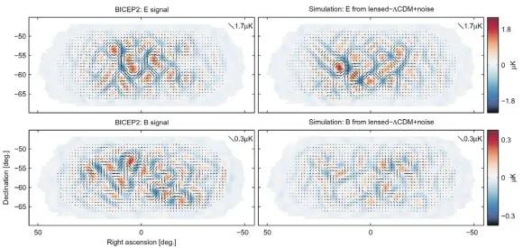 На рис. 2 показаны снятые карты поляризации, разложенные на Е-моду (слева вверху) и В-моду (слева внизу). Длина черточек пропорциональна степени линейной поляризации, направление указывает направление поляризации. Справа — результат численного моделирование Е- и В-моды для случая, когда гравитационные волны отсутствуют (напомним, В-мода в этом случае появляется за счет гравитационного линзирования).
