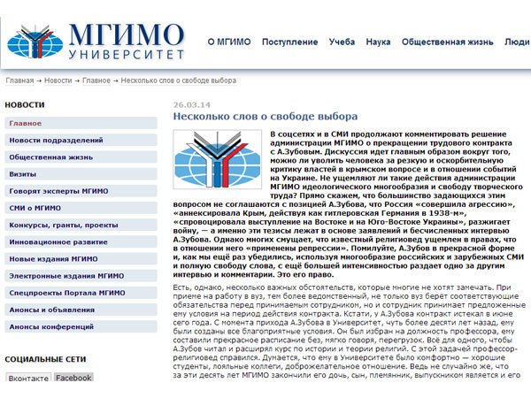 Напомним, что увольнение Андрея Борисовича Зубова, доктора исторических наук, профессора МГУ, состоялось 24 марта 2014 года приказом ректора МГИМО. На сайте университета отмечается, что «это решение вызвано тем, что Зубов А.Б. сознательно и неоднократно нарушал Устав МГИМО, Правила внутреннего распорядка и Положение МГИМО об основных принципах корпоративного поведения, которые определяются ведомственной принадлежностью МГИМО к МИДу России».