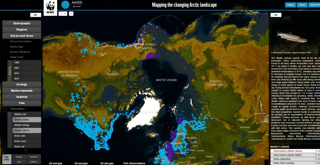 Данные на карте представлены на отдельных слоях: пользователи могут проследить изменения в снежном покрове, начиная с 1984 года, узнать информацию о ведущихся разработках месторождений нефти и газа, изучить представителей флоры и фауны и т.д. В карту встроены инструменты рисования, с помощью которых пользователи могут делать важные пометки.