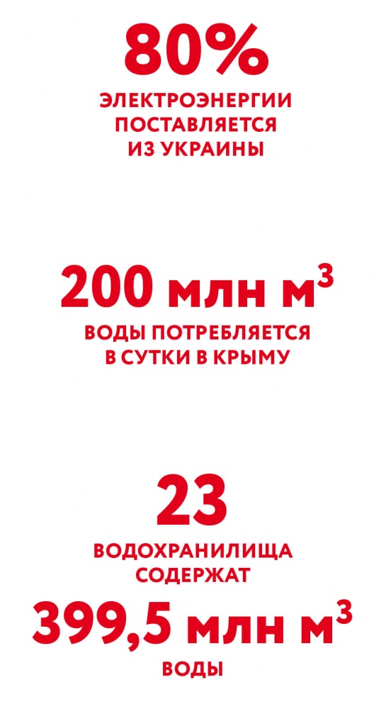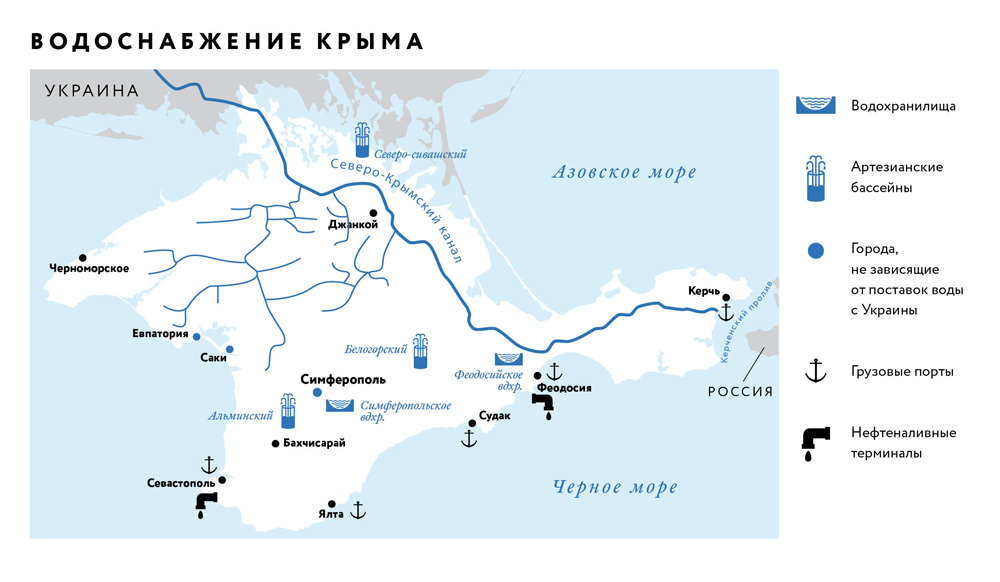 Собственные источники воды на полуострове есть только в горах — это порядка 20% от необходимого объема. Остальные 80% поступают из Северо-Крымского канала в степные районы, северный и восточный Крым. Коктебель, Феодосия, Керчь, Симферополь, Севастополь — все они полностью зависят от днепровской воды.