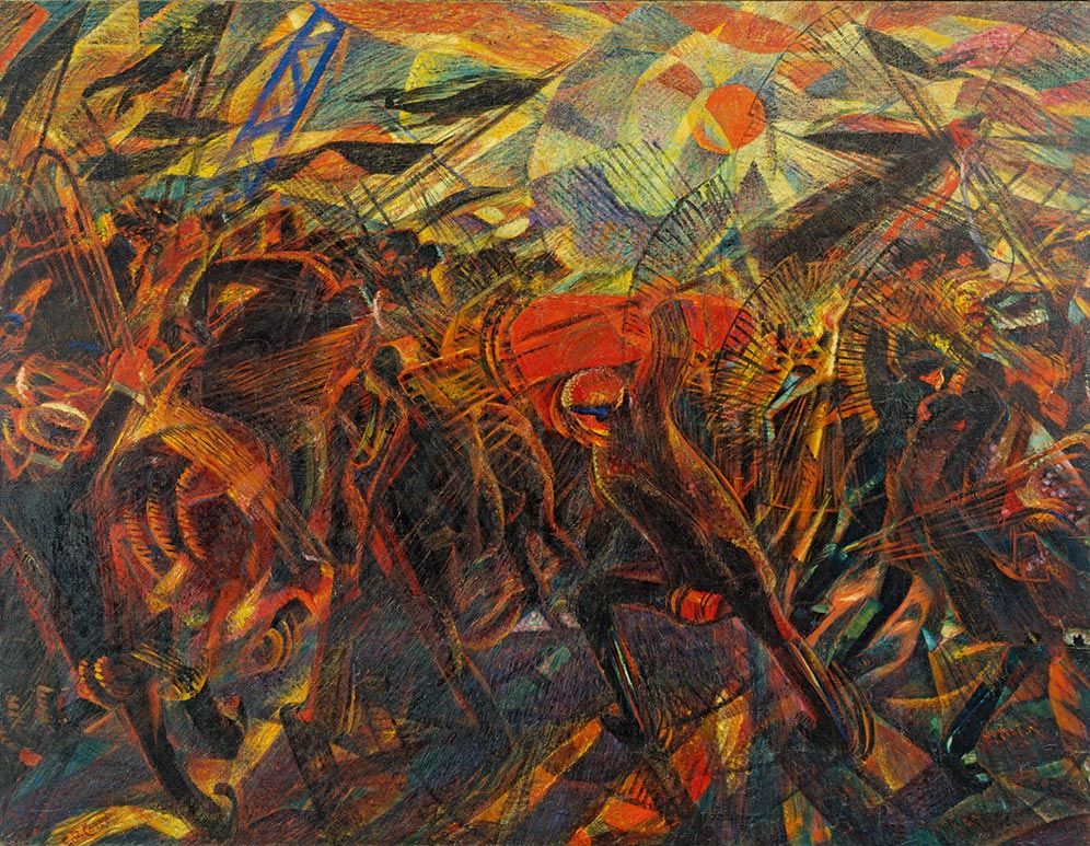 Мирная версия этого сюжета - “Динамизм велосипедиста” Умберто Боччони. Иллюстрируя свежее открытие Эйнштейна, приравнявшего массу к энергии, художник изобразил вихрь на двух колесах. Такой же, но монументальный портрет энергии тот же автор запечатлел в пейзаже стройки. По обочинам холста растут новые дома, толпятся рабочие, высятся краны, но центр захвачен бешеным водоворотом цветных волн и частиц. Присмотревшись, мы увидим в их пляске разномастных коней, издревле символизирующих вырвавшуюся на свободу стихию.