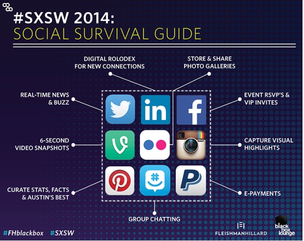 SXSW (South by Southwest) − это серия интерактивных, образовательных, музыкальных и кинофестивалей и конференций, которая ежегодно проходит в Остине, штат Техас. В этом году команда FH black box Lounge подумала обо всех важных приложениях, социальных сетях и других инструментах, которые будут полезны участникам как SXSW, так и любого другого большого мероприятия и фестиваля.