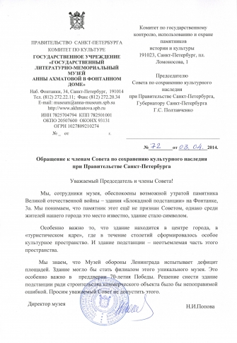 Вчера известный петербургский поэт и бард Александр Городницкий обратился к комиссии по культуре Законодательного собрания и Совету по культурному наследию с открытым письмом в защиту подстанции. Сегодня обращение к членам Совета по сохранению культурного наследия при правительстве Петербурга направили сотрудники Музея Анны Ахматовой.