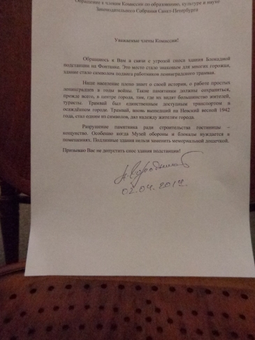 Несколькими днями раньше письмо в защиту памятника блокады губернатору Петербурга написали ветераны исторического факультета МГУ, а в комитет по охране памятников обратились сотрудники музея педучилища № 8.