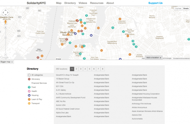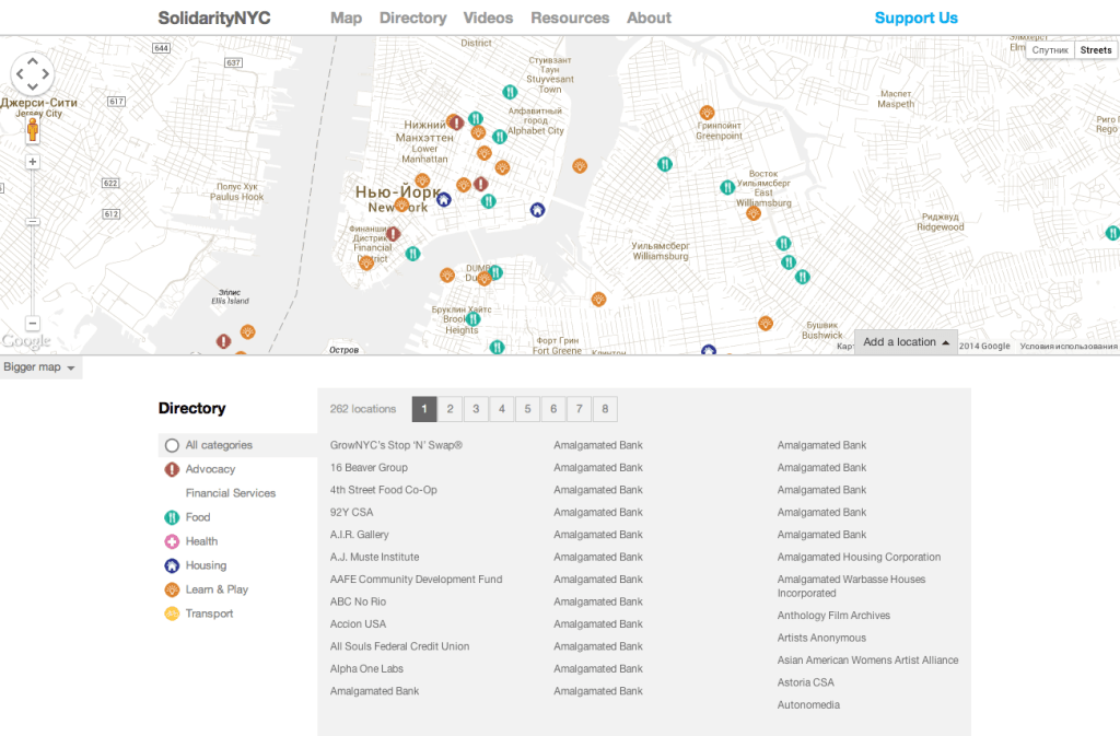 Карта The Solidarity Economy включает объекты, представляющие солидарную экономику в Нью-Йорке.
