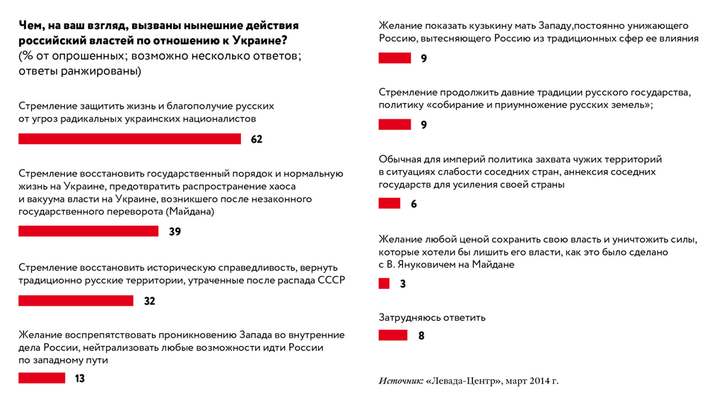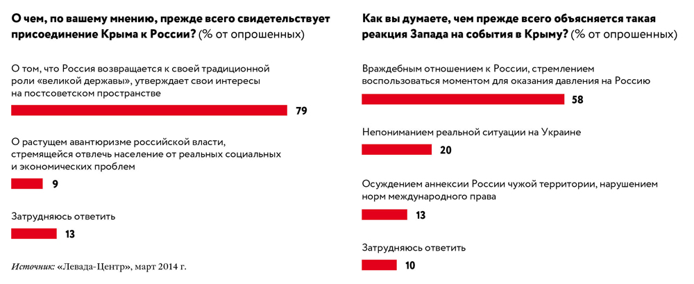 Надо признать: пропаганда сработала. Произошел перенос внимания: массовые протесты на Украине против коррумпированной власти стали восприниматься российским населением, страдающим от не менее коррумпированной власти, как «беспорядки», учиненные мнимыми бандеровцами, движимыми «русофобией». А присвоение Крыма — как торжество национального духа и величия, как компенсация за собственное бесправное и унизительное состояние: пусть эти «хохлы» и сумели выгнать своих властных воров, чего мы не можем, но мы зато приросли территорией, вернули свое! И мало того, показали кукиш Западу, который в риторике кремлевской пропаганды выступал подстрекателем Майдана (в декабре и январе такую версию событий разделяли 83% россиян), а значит, и русофобии.
