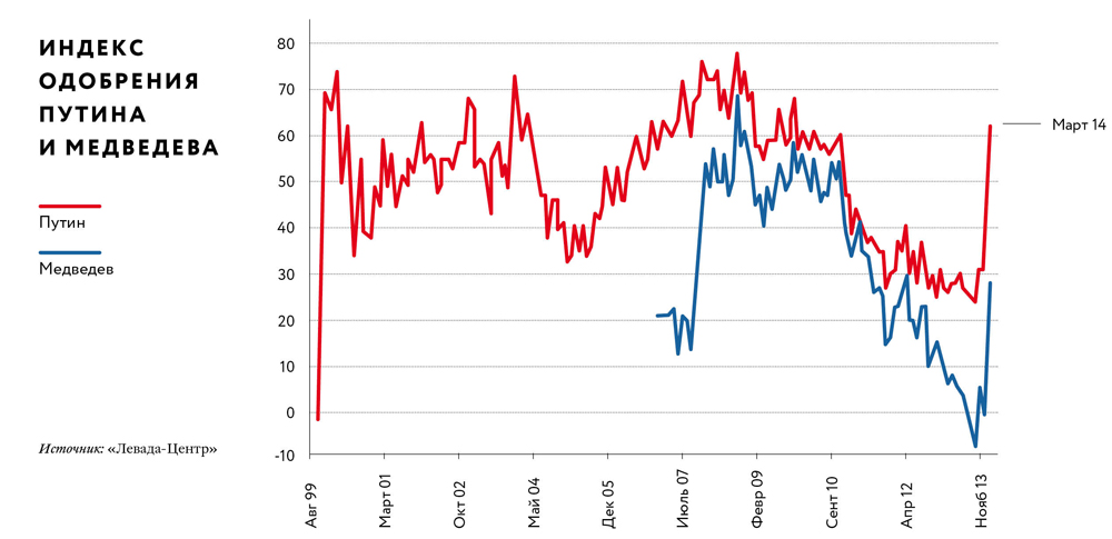 Более 85% россиян, опрошенных в конце марта «Левада-Центром», испытывали эмоциональный подъем и радостные чувства по случаю присоединения Крыма (упоминались «торжество справедливости», «гордость за страну» и т.п.). Одновременно с этим вверх пошли все социальные индексы, включая оценки положения дел в стране, одобрение политики президента, правительства, губернаторов и даже Государственной думы, хотя экономические показатели, и прежде всего потребительские настроения, явно ухудшились. Людей с иным настроем и другими переживаниями (неодобрения, протеста, возмущения, стыда, отчаяния, тревоги) в общей сложности набралось лишь 7% (и столько же и равнодушных). Трудно поверить, что всего три недели массированной телевизионной пропаганды, пускай и беспрецедентной по своей агрессивности и демагогии, могут так радикально изменить характер массовых настроений. Однако сваливать все на сужение поля альтернативных каналов информации и промывание мозгов — это обманывать себя. Убедить людей можно лишь в том, в чем они хотят убеждаться.