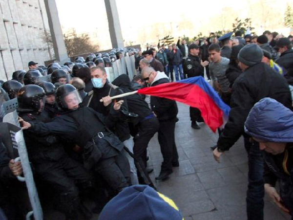 Милиция оценила численность обеих акций в полторы, примерно, тысячи человек. А вот к ночи сообщили, что митингующие примерно в 21.00 решили штурмовать здание обладминистрации (впрочем - они весь день говорили, что вот-вот пойдут штурмовать). К этому моменту на многих из них уже оказались маски и каски, а вооружены они были палками. В сторону милицейского оцепления кидали камни и взрыв-пакеты. Затем они попытались прорвать кордон и минут через 10 в этом преуспели. Впрочем, милиция практически не оказывала сопротивления, а потом и вовсе ушла, оставив свободным вход в обладминистрацию. Ну, активисты туда зашли и, примерно в 21.30, подняли над зданием флаг России, свидетели добавляют, что флагом России махали и со второго этажа здания.