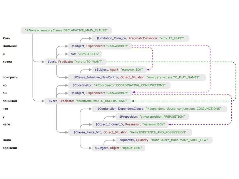 Во-вторых, ABBYY Compreno имеет синтаксический анализатор, которые определяет структуру предложения и отношения между входящими в него словами. В этой области программа умеет справляться с немалым числом «подводных камней», которые не составляют проблем для человека, владеющего языком, но требуют специальных алгоритмов для компьютерного анализа. Среди таких случаев опущение повторяющейся части предложения («Маша говорит и читает по-шведски, а Катя – по-норвежски») или местоименная анафора («Маша хорошо знает шведский язык. Она изучала его пять лет.). Программа синтаксического анализа в этих случаях понимает, что в первом предложении Катя по-норвежски говорит и читает, а во втором она – это Маша, а он – это шведский язык. Для более точного синтаксического анализа используются данные о семантике слов, которые хранятся в семантическом компоненте. Он позволяют описать связи между словами в предложении и функцию этих слов (действие, место и пр.). Наконец, используются статистические алгоритмы, которые, например, помогают справиться с омонимией. Проанализировав количество слов из разных семантических областей, с которыми связано многозначное слово, программа выберет нужное значение. В результате программа оказывается способной учитывать контекст и правильно понять фразу «Эти типы стали есть на складе» в зависимости от того, идет речь о металлургии или о поведении складских работников.