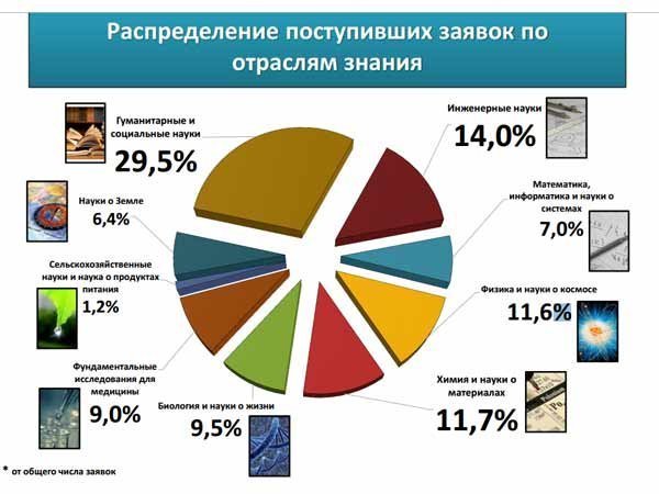 Наибольшее число заявок – 29.5% было подано от представителей гуманитарных и социальных наук, 14% – от представителей инженерных наук, 11.7% – от исследователей в области химии и наук о материалах, 11.6% – от ученых из области физики и наук о космосе, 9.5% – от биологов, 9% – медиков, 7% – математиков.
