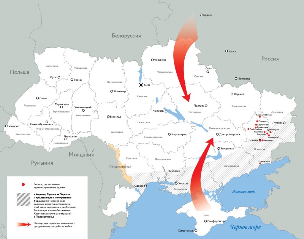 Действия России в восточных областях Украины основаны на технологиях управляемого конфликта. С одной стороны, Москва закрепляет военное присутствие на границе с Украиной, обеспечивая себе сильные международные переговорные позиции, сколь бы долго ни шли переговоры. С другой — идет целенаправленная раскачка ситуации в соседней стране: силы специальных операций, диверсанты и местные захватывают административные здания и важные объекты в украинских восточных и юго-восточных областях. После чего, как правило, следует обращение к властям Российской Федерации за силовой поддержкой с последующим вводом войск — для постановки победной точки.