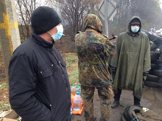 За ночь разгневанные жители востока соорудили четыре блок-поста. На каждом – по 40-50 человек, автопокрышки, костры в бочках, готовят еду. Тетеньки в фирменных дождевиках «Партии Регионов» раздают чай и бутерброды. Мужики жалуются: «Нет работы, а жрать надо». Городок этот и правда совсем беден: разбитые дороги, стихийные свалки. Последний крупный работавший завод «Славтяжмаш» закрывается и переводит людей в неоплачиваемые отпуска. Ранее закрылся завод ПВХ – бывшие рабочие, которые теперь ополченцы, говорят, что Россия с весны перестала закупать их полиэтилен. Не работает завод керамических изделий. Жители, кто на машинах, подвозят на блок-посты покрышки и еду, пенсионерки несут лекарства. Нас с покрышками возит на пикапе коммерсант Артем, владелец рыбного магазина.
