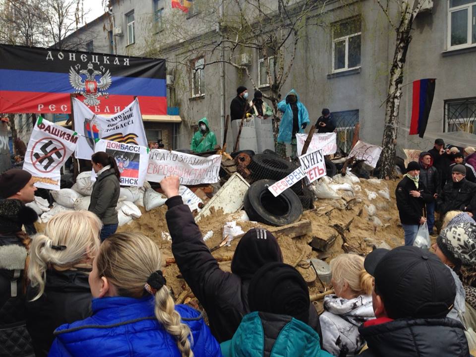 14:05 Павел Каныгин: Здание городского отдела СБУ занято пророссийскими активистами. Здесь пока тоже все спокойно, боев нет. Журналистов внутрь здания не пропускают.